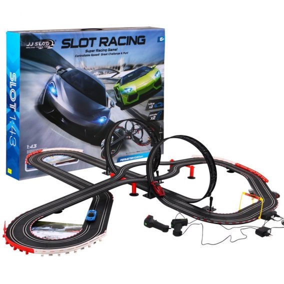 Duży tor wyścigowy z dwoma autami to gratka dla każdego amatora wyścigów samochodowych. Długość toru to aż 1020 cm, wymiary toru w stanie zmontowanym 190 cm x 168 cm, skala 1:43. Tor zasilany jest z sieci 220V, zasilacz 12V. Podczas jazdy w autkach świecą się przednie światła.