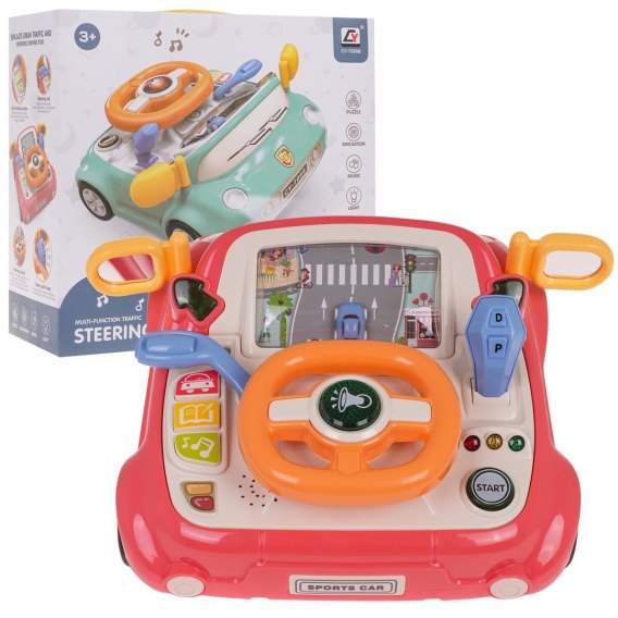 Interaktywna zabawka w kształcie autka z efektami dźwięku i światła dla dzieci powyżej 3-go roku życia. Zabawkowe autko do nauki zasad ruchu drogowego wykonane zostało z najlepszej jakości plastiku w żywych kolorach. Nie posiada ostrych krawędzi, jest w pełni bezpieczne dla malucha. Z przodu autka mamy świecące lampy, a pod spodem pojazdu znajdują się przyssawki. W środku autko posiada ruchomą kierownicę z podświetlanym klaksonem, dźwignię biegów, podświetlane migacze, sygnalizację jazdy (zielony, żółty, różowy), przyciski dźwiękowe z odgłosami wydawanymi przez pojazd, muzyczka, a na ekraniku znajdującym się za szybką przesuwającą się drogę i autko, którym dziecko musi kierować. Po bokach samochodu znajdują się duże lusterka. Zabawka zasilana jest bateriami typu 3 X AA 1,5 V (brak w zestawie) Funkcje zabawki: - przeznaczona dla dzieci od 3-go roku życia, - wykonana z najlepszej jakości plastiku i nie posiada ostrych krawędzi, - efekty świetlne: przednie reflektory, kierunkowskazy, klakson, sygnalizator jazdy, - efekty dźwiękowe: klakson, migacze, przycisk start, odgłosy pojazdu, melodie, - 4 przyssawki na spodzie pojazdu, - żywa kolorystyka, - uczy zasad ruchu drogowego, - rozwija koordynację ręka-oko, - ruchoma kierownica, - ruchomy pojazd na ekraniku, - ruchoma droga na ekraniku. |
