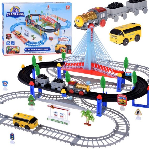 • W zestawie: lokomotywa, autobus, wagony, elementy toru, most wiszący, akcesoria (drzewka, znaki, pojazdy)