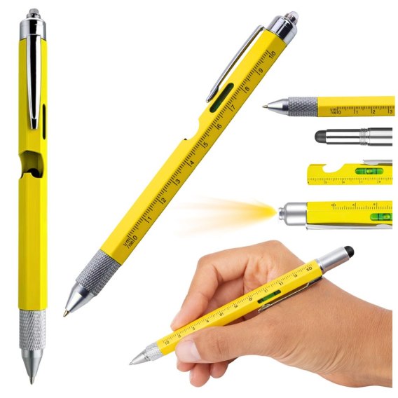 Długopis wyposażony jest w poziomicę, skalę pomiarową, dwa rodzaje śrubokrętów, otwieracz do butelek, uchwyt na telefon, pióro do obsługi ekranów dotykowych oraz wbudowane światło LED. Dzięki temu doskonale sprawdzi się podczas drobnych napraw, projektów DIY, pracy biurowej, a także w terenie, np. podczas biwakowania czy wędkowania. Funkcja LED umożliwia doświetlenie miejsca pracy w słabszych warunkach oświetleniowych.