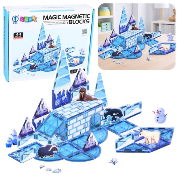 LEAN Toys Klocki Magnetyczne Lodowa Kraina Figurki Zwierząt Niebieskie 44 el.