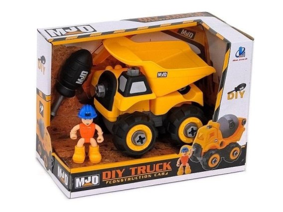 Pojazd budowlany, wywrotka, do skręcania, z figurką robotnika i śrubokrętem.