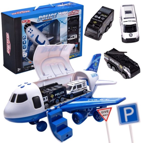 Poznaj DUŻY otwierany samolot-transporter policyjny od marki WOOPIE! który zabierze dziecko w ekscytującą misję stróżów prawa! W przestronnym kadłubie samolotu zmieszczą się trzy policyjne auta oraz komplet znaków drogowych, co zapewnia dynamiczną zabawę. Dzięki czterem przyciskom zabawka wydaje realistyczne syreny policyjne, a migające diody LED dodają akcji dynamiki. Rampa samolotu opada, a uchwyt ułatwia przenoszenie, co sprawia, że to zabawka mobilna i praktyczna. To wymarzony prezent dla małego policjanta od 3. roku życia, który rozwija wyobraźnię i uczy pracy zespołowej.