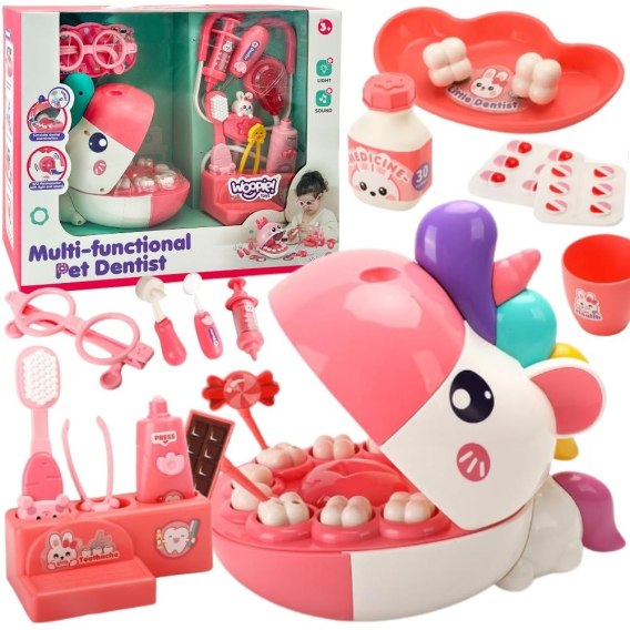 Zestaw małego dentysty głowa jednorożca to wyjątkowa zabawka edukacyjna, która wprowadza dzieci w świat medycyny i dbania o zdrowie jamy ustnej w sposób pełen radości i fantazji Dzięki temu zestawowi maluch może wcielić się w rolę małego dentysty, przeprowadzać badania, leczyć ząbki pacjenta i uczyć się podstaw higieny w zabawny oraz bezpieczny sposób. Realistyczny kształt zębów i przyjazny wygląd kolorowego jednorożca sprawiają, że dziecko z zaciekawieniem odkrywa każdy element zabawy. Otwierana paszcza z zestawem zębów pozwala na symulację prawdziwego badania dentystycznego - maluch może zaglądać do środka, używać narzędzi i przeprowadzać „leczenie". W zestawie znajduje się wszystko, co potrzebne do małej kliniki dentystycznej: lusterko, szczypce, strzykawka, szczoteczka do zębów, a także stetoskop z efektami świetlnymi i dźwiękowymi. Dziecko może wcielać się w rolę lekarza, pacjenta lub asystenta - dzięki czemu zabawa staje się dynamiczna, angażująca i pełna emocji. Zestaw został zaprojektowany tak, aby nie tylko bawić, ale i uczyć. Dziecko poznaje budowę jamy ustnej, dowiaduje się, dlaczego mycie zębów jest tak ważne, oraz jak unikać próchnicy. Zabawka pomaga także w oswojeniu lęku przed wizytą u dentysty, dzięki czemu późniejsze spotkania z prawdziwym lekarzem przebiegają spokojniej. Wszystkie elementy zostały wykonane z trwałych, bezpiecznych dla dzieci materiałów o gładkich, zaokrąglonych krawędziach. Całość utrzymana jest w estetycznej pastelowej kolorystyce, która przyciąga wzrok i zachęca do zabawy. Zestaw jest bogaty w detale i pozwala dziecku poczuć się jak prawdziwy dentysta. Wszystkie elementy są lekkie, łatwe do uchwycenia przez małe rączki i starannie dopasowane do wieku dziecka. Świetnie sprawdzi się zarówno w domu, jak i w przedszkolu jako pomoc edukacyjna.